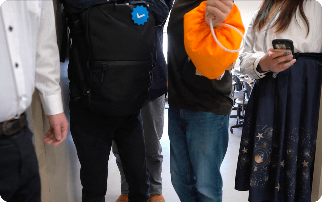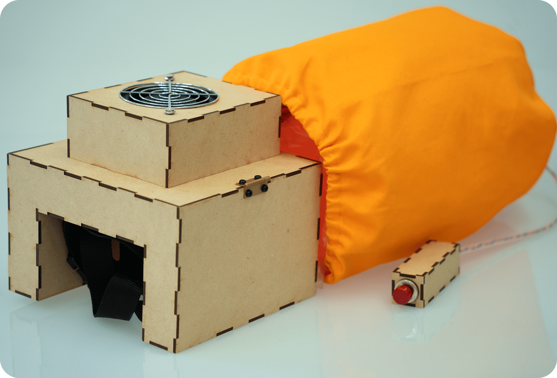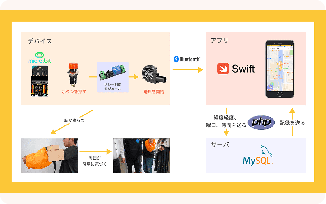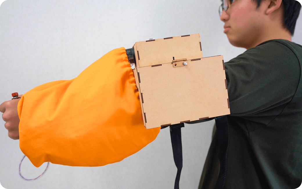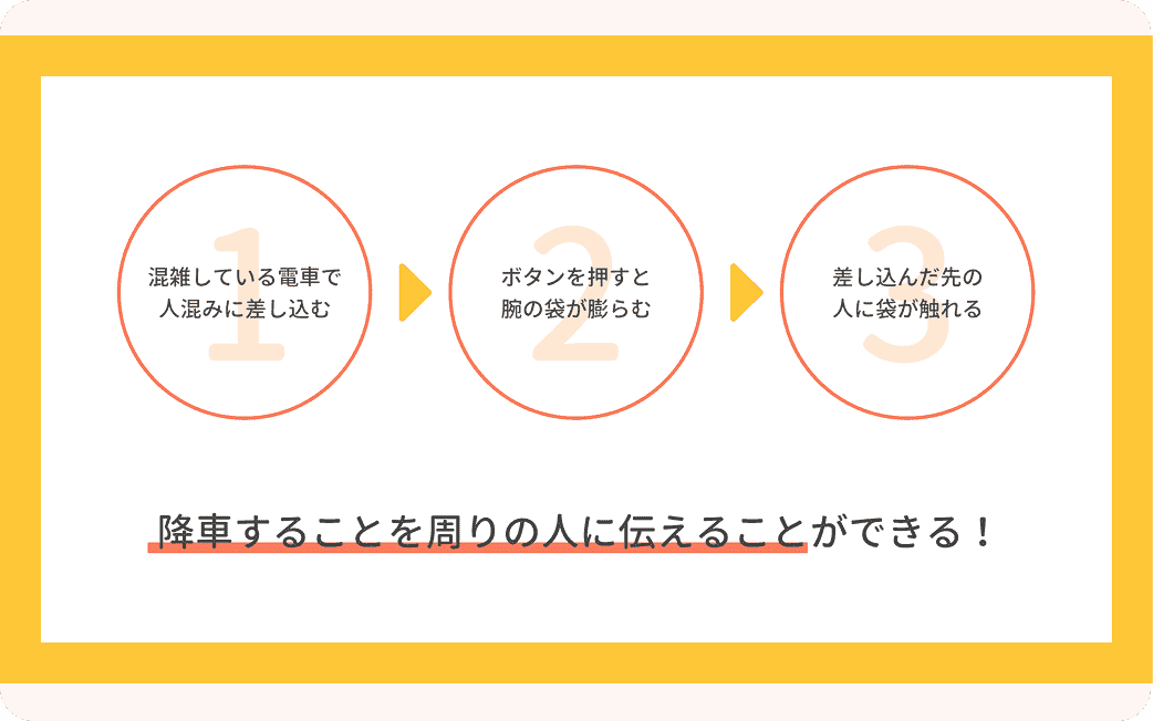 本作品は混雑した電車を降りる際に前の人にぶつかってしまう問題を解決するデバイス。 腕のバルーンを膨らませることで周囲との距離を自然に確保し、スムーズで快適な降車を実現します。専用のスマホアプリでは、デバイスが使用された場所と時間が表示され、電車の混雑するタイミングを可視化することで、そもそもの問題である混雑した電車を避けることができます。本作品が広がることで、多くの人にとって快適な交通利用を実現します。